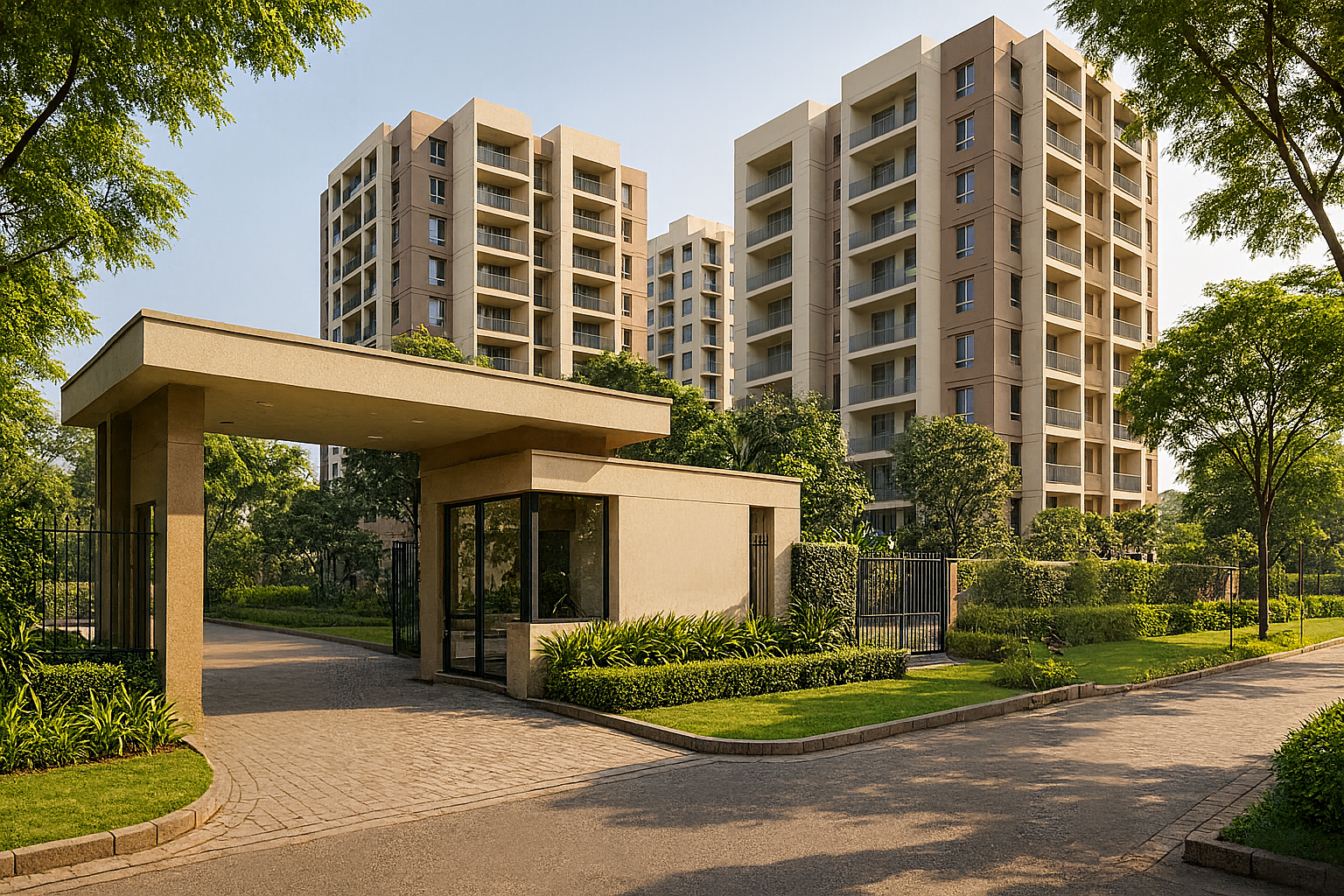 Landscaped courts, community lawns and shaded pathways ensure that many homes at SKDJ Nidhara look onto soothing green pockets rather than hard edges.