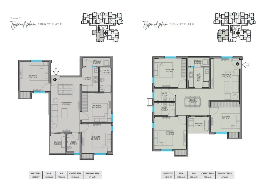 • Configuration & Sizes: The homes are designed to suit modern families and investors. 2 BHK units start from ~740 sq ft super built-up area (SBA) and extend up to ~890 sq ft; the 3 BHK units range from ~1,020 sq ft up to ~1,180 sq ft.
